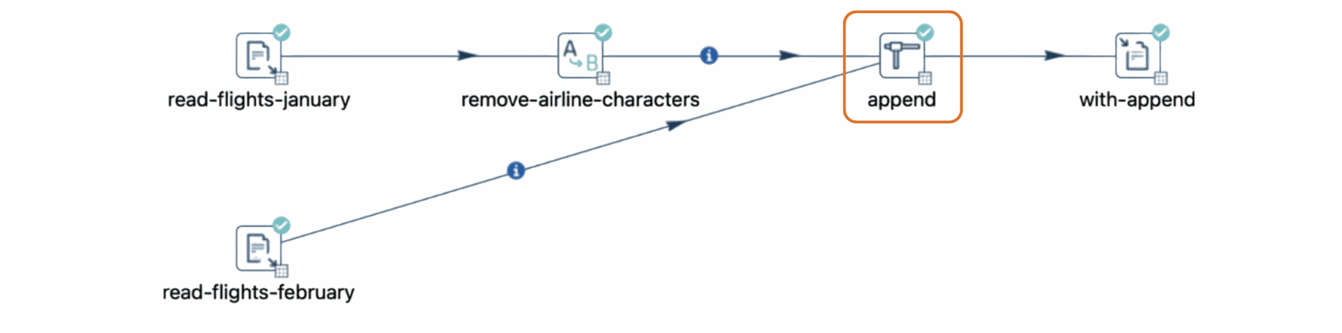 - Append Streams: Use the Append Streams transform to combine the cleaned January data with the February data.
