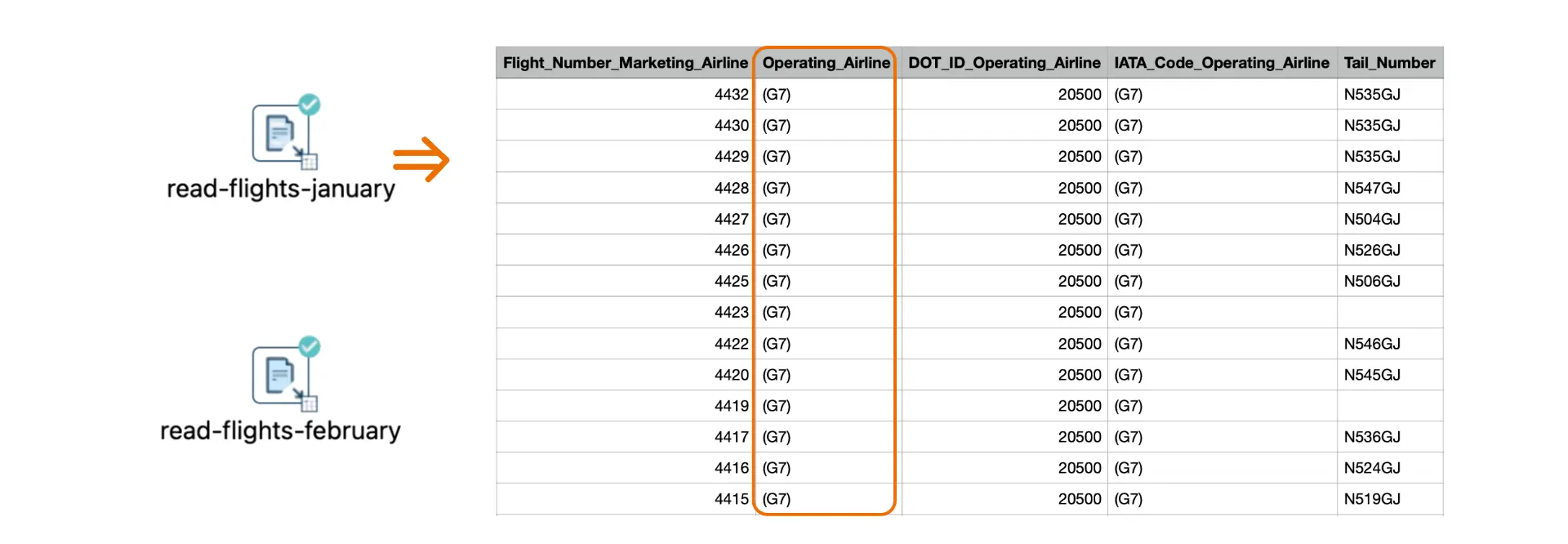 Imagine you have the same two flight data files: flights_january.csv and flights_february.csv. Both files have identical columns. However, the "Operating Airline" column in January’s file contains extra characters, like parentheses, that need to be cleaned up.