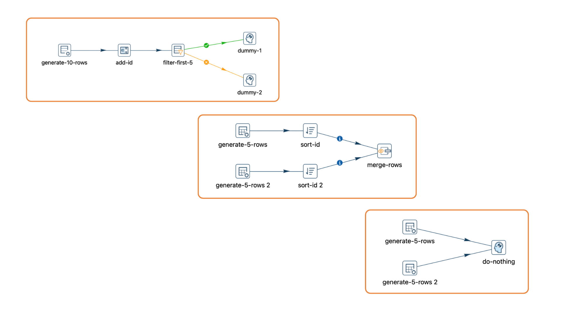 #1 In this post we covered some examples of how a pipelines is executed when data is filtered, joined or appended. Take into account that the transforms used are not the only options in Apache Hop to perform those operations.