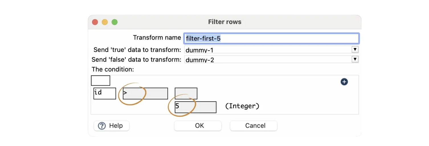 #2 The "Filter Rows" transform enables you to sift through rows based on specified conditions and comparisons. It influences the workflow when linking the True or False outcomes to other transforms. There are three available paths as outputs: True, False, and Main. The Main output exclusively follows the True path.