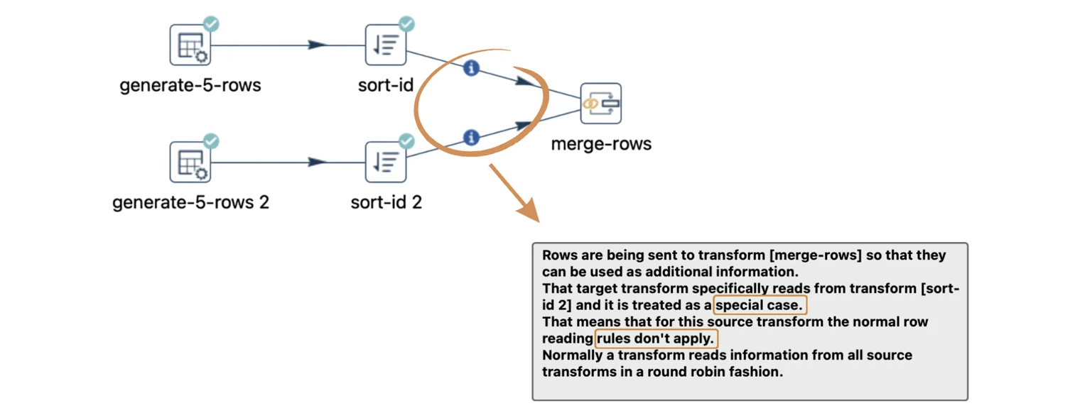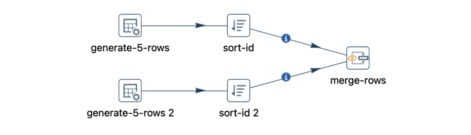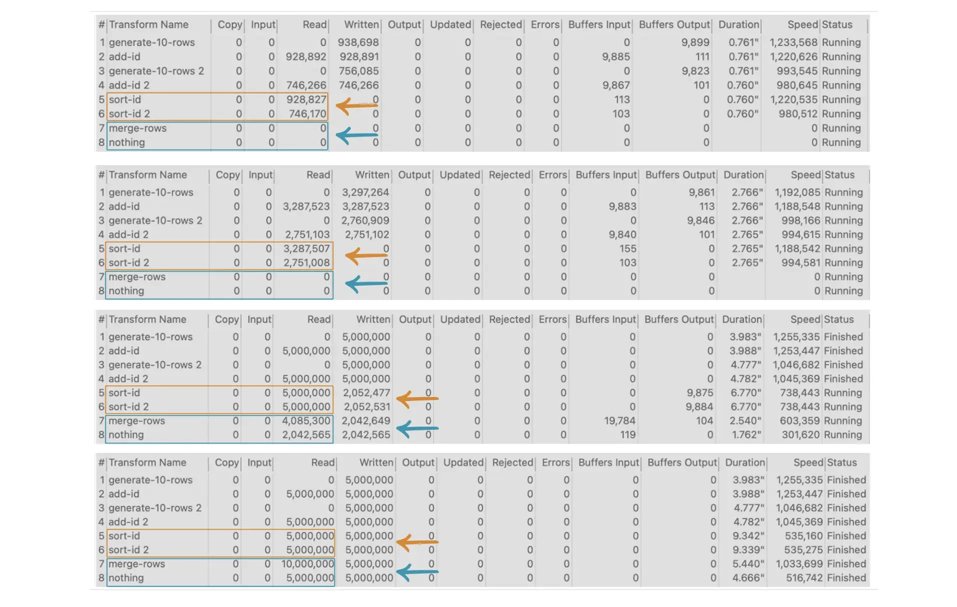 Note that the “merge-rows” transform doesn't start its execution until all rows are sorted, at which point it begins to execute the join and gradually sends the rows to the ”Dummy” transform.