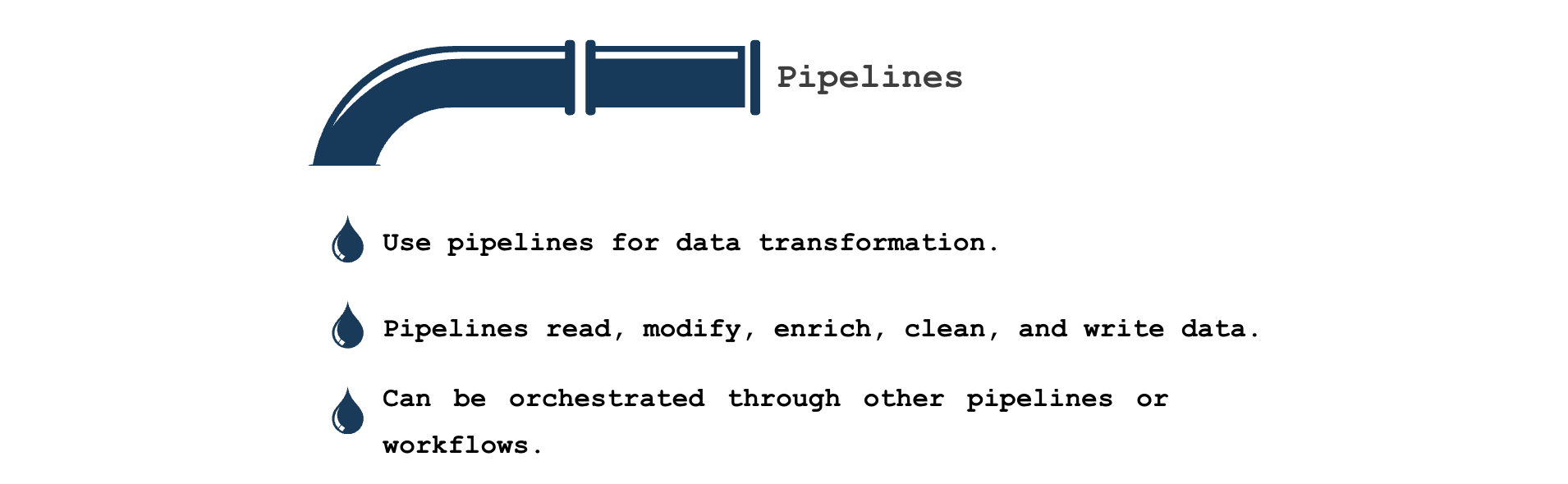 - Pipelines are the backbone of data processing, responsible for reading, modifying, enriching, cleaning, and writing data.