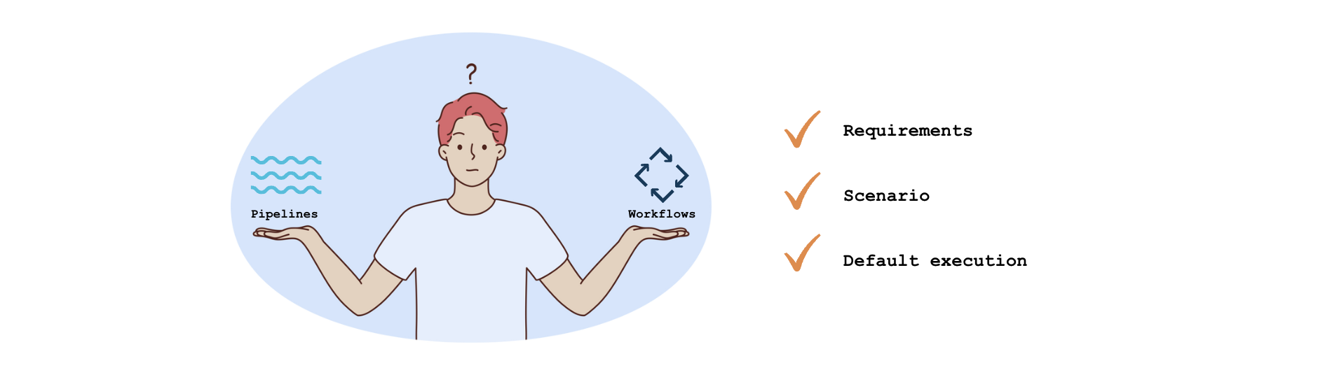 However, the decision between pipelines and workflows isn't always straightforward. It hinges on the specific requirements and varies depending on your scenario.
