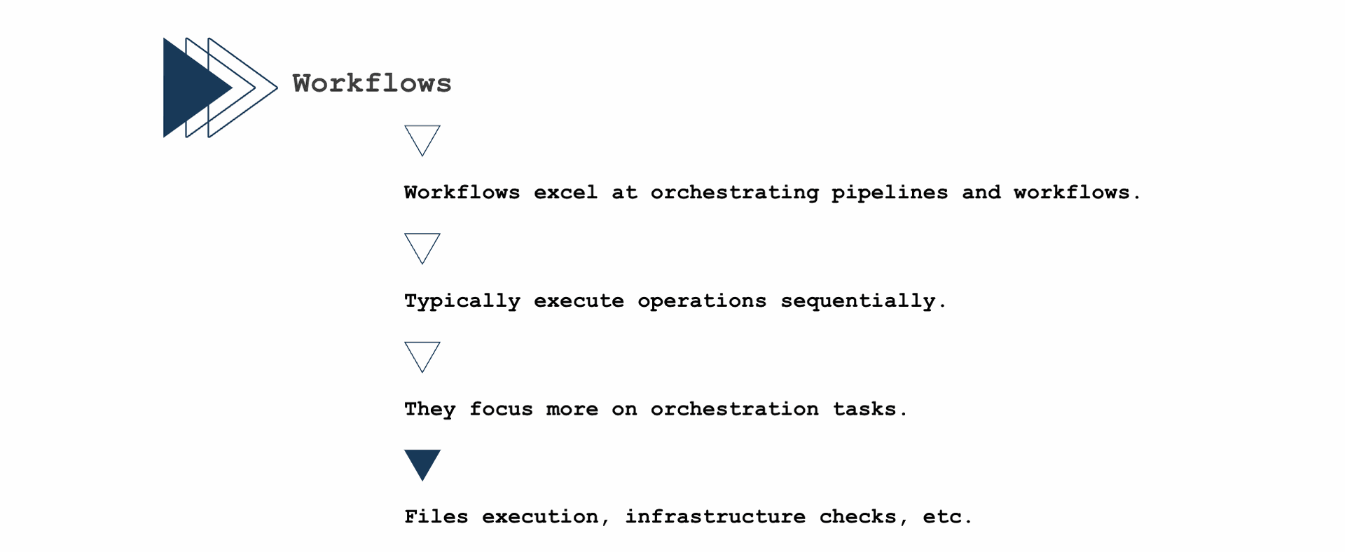 - Workflows focus less on direct data manipulation and more on overarching orchestration tasks such as file execution, infrastructure verifications, email notifications, error handling, and more.