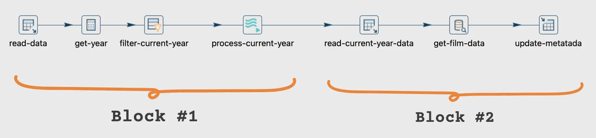 Specifically, we should design the implementation to execute each block sequentially, ensuring that data processing and extraction occur in the required order.