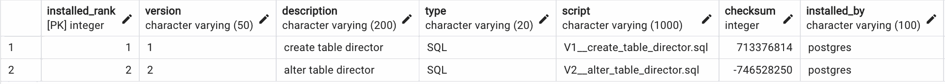 - Migration handling: In this example, we first create the director table with fields like director_id, first_name, last_name, and birth_date. In the second migration (V2), we add the nationality field to the table. Flyway automatically tracks which migrations have already been applied, ensuring they are not executed again.